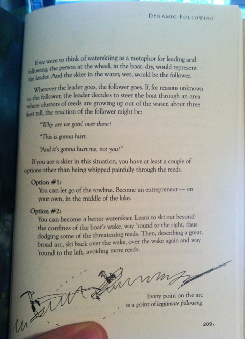 « If we were to think of waterskiing as a metaphor for leading and following, the person at the wheel, in the boat, dry, would represent the leader. And the skier in the water, wet, the follower »