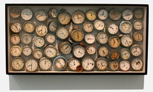 « Arman’s Accumulations, collections of discarded objects, draw attention to the reverse side of consumer culture. This collection of various alarm clocks, each brocken and marking a different minute and hour, emphasizes the futility of trying to possess and mesure time. »