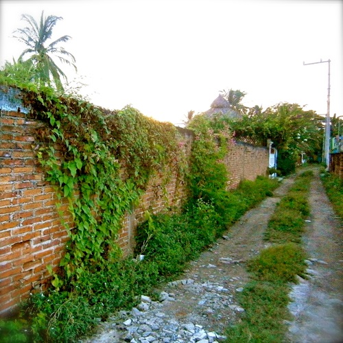 L’écriteau, finalement, au sommet du mur. Il semble fait d’une banale plaque de mortier dans laquelle des lettres ont été gravées, probablement avec une branche. En agrandissant la photo plusieurs fois on peut y lire: «Calle Morelos Privada ». C’est un chemin privé, si je comprends bien.