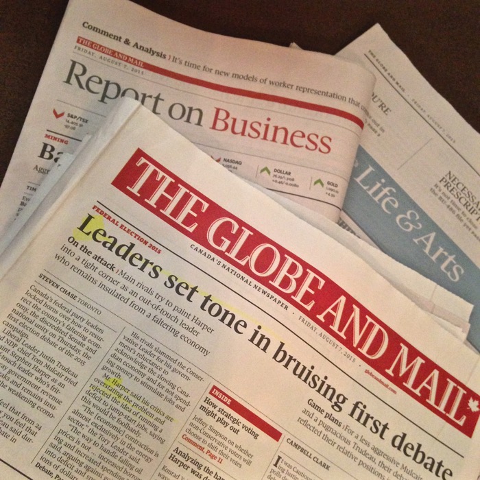 Parallèlement, la maisonnée s’est abonnée au Globe and Mail pour la durée de la campagne électorale fédérale. J’en parlais sur Facebook un peu plus tôt cette semaine.