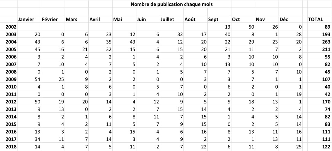 Troisième constat, je suis pas mal fier de tenir ce blogue depuis septembre 2002, et cela quasiment sans interruptions (plus longue interruptions a duré trois mois, en 2011). Et je me trouve encore plus chanceux de constater de pouvoir compter sur des lecteurs pour tous mes textes.