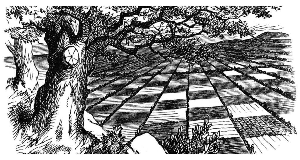 — Ma parole, on dirait exactement les cases d’un échiquier ! (…) C’est une grande partie d’échecs qui est en train de se jouer… dans le monde entier… du moins, si ce que je vois est bien le monde. Oh ! comme c’est amusant ! Comme je voudrais être une des pièces ! Ça me serait égal d’être un Pion, pourvu que je puisse prendre part au jeu… mais, naturellement, je préférerais être une Reine. (…)