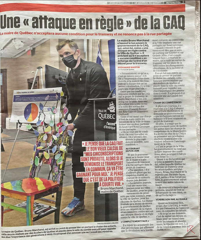 La relation entre tous les acteurs du monde municipal comporte un grand potentiel. Je n’hésiterais pas à transmettre une photo de la chaise avec un mot d’accompagnement à tous les maires du Québec.