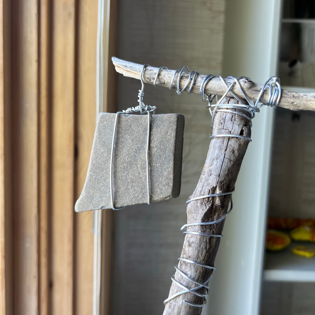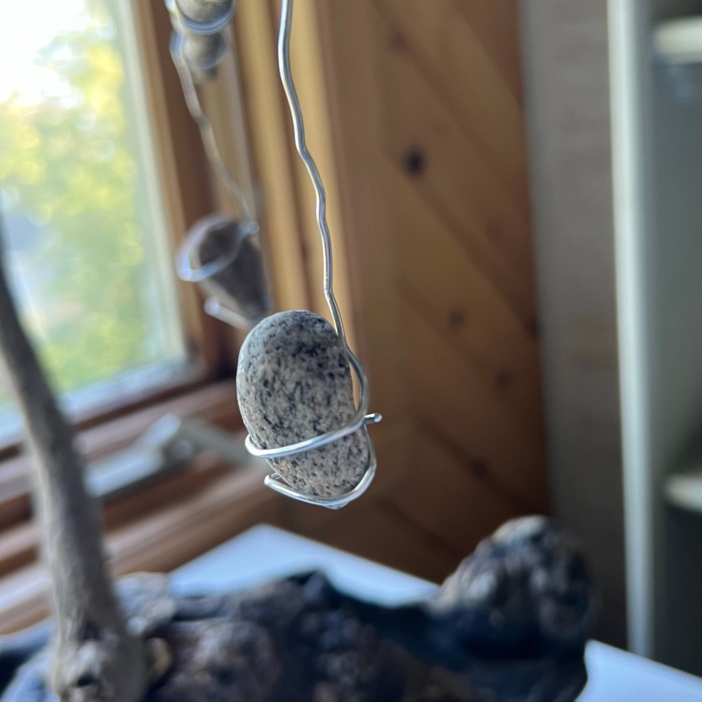 J’ai fait deux créations au cours de l’après-midi, dont celle-ci: une sorte de mobile composé de bois de grève, de cailloux et de fil d’aluminium.