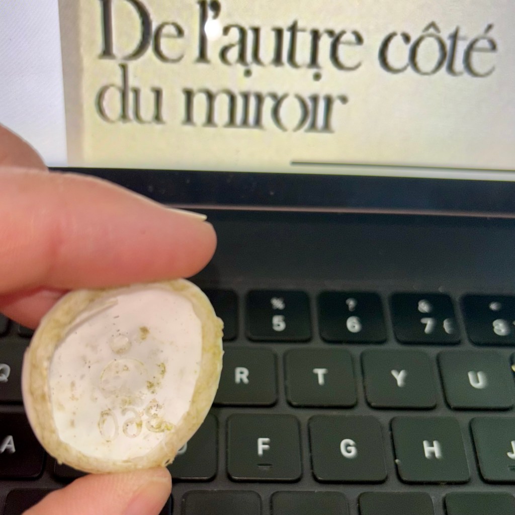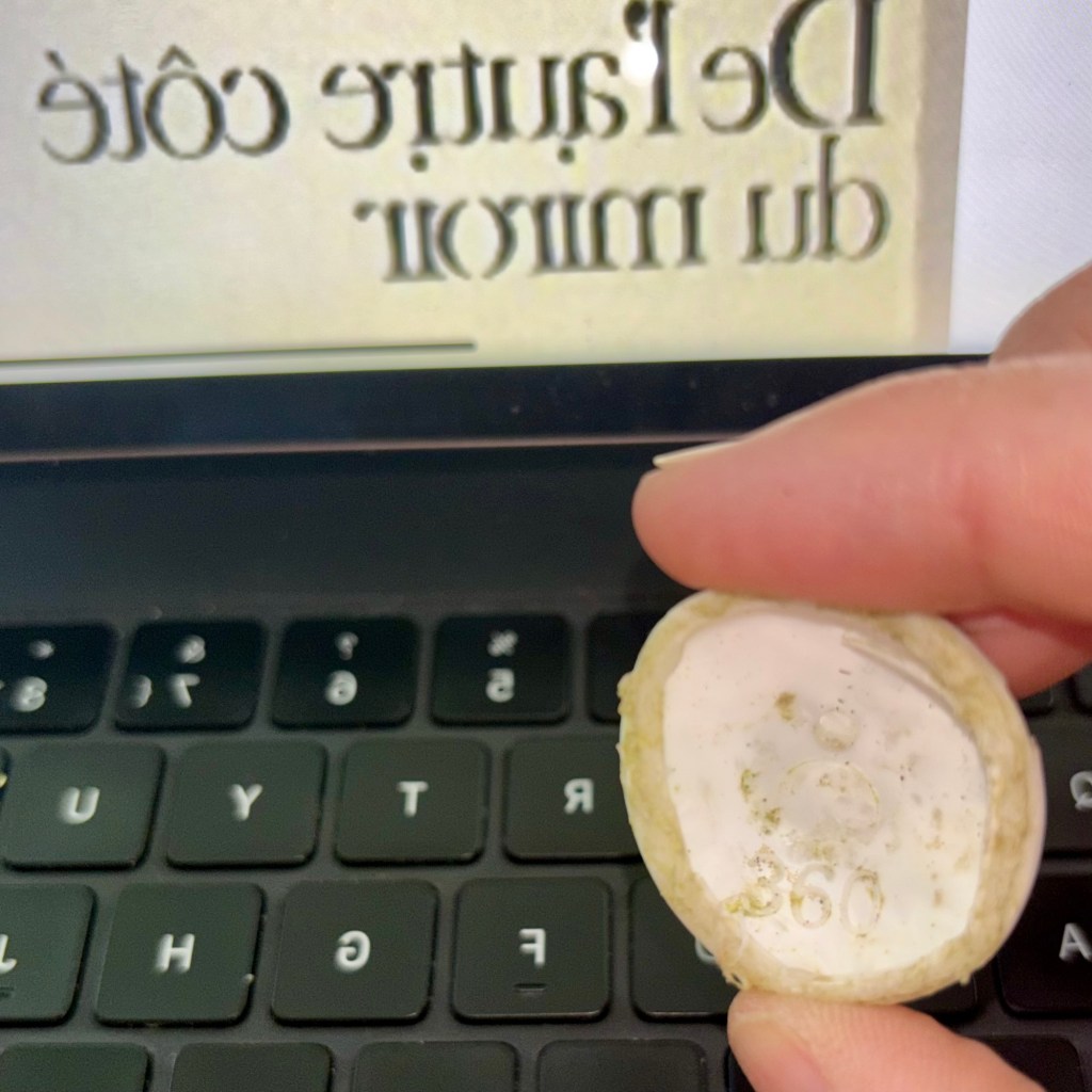 Alors, pour en revenir au débris de plastique: il a l’allure d’un chapeau de champignonet à l’intérieur on peut lire « 360 », mais écrit pour devoir être lu à l’envers. C’est étonnant.