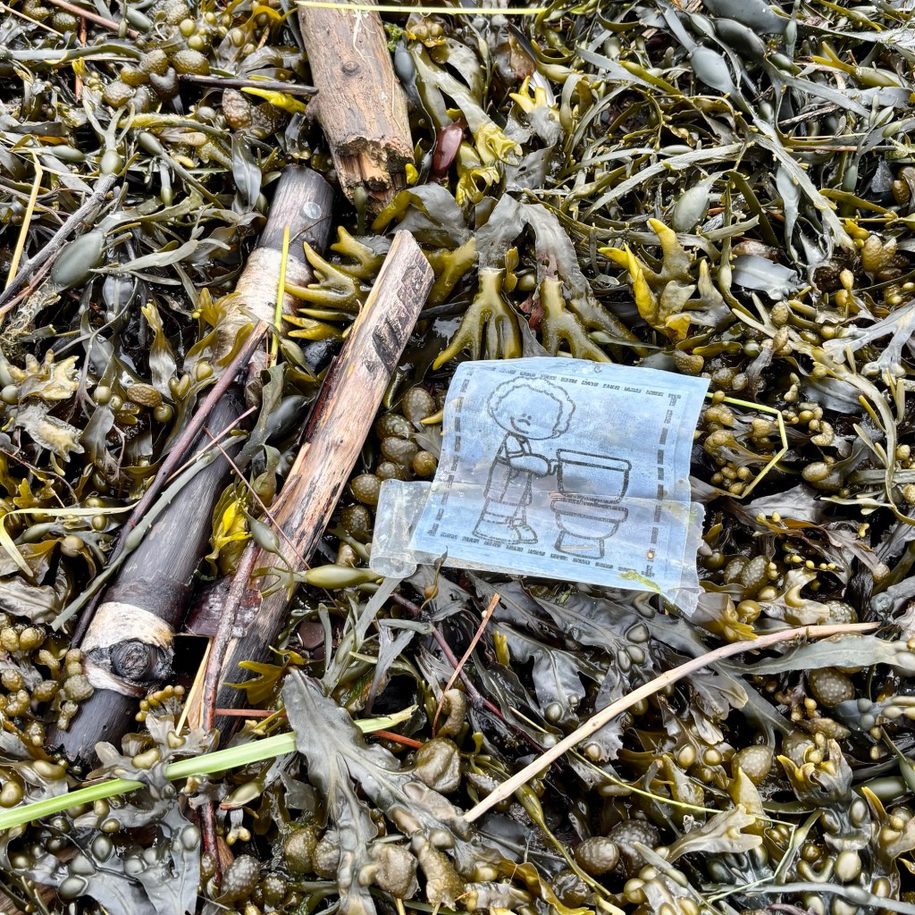 J’ai trouvé particulièrement amusante cette étiquette transparente trouvée à travers les algues.