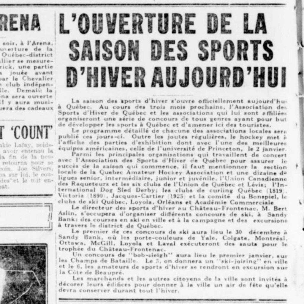 La saison des sports d’hiver s’ouvre officiellement aujourd’hui à Québec. Au cours des trois mois prochains, l’Association des Sports d’Hiver de Québec et les associations qui lui sont affiliées organiseront une série de concours de tous genres ayant pour but de développer les sports à Québec et d’amener ici des touristes.