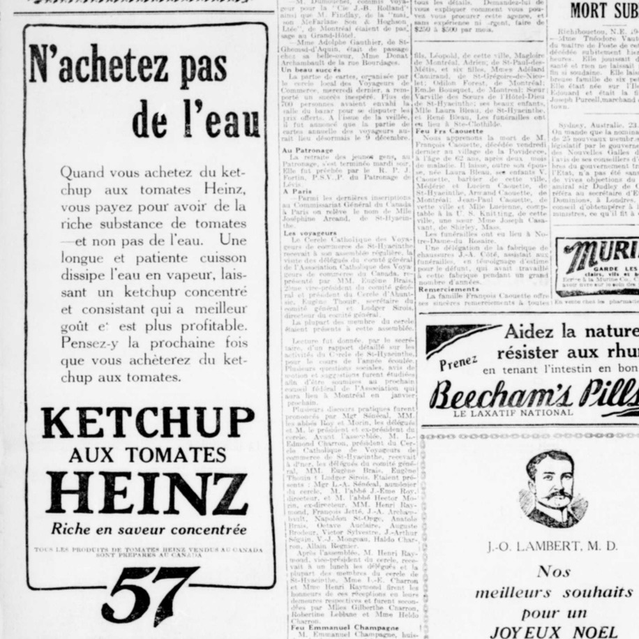 Parmi les découvertes: plusieurs publicités amusantes (dont une pour le Ketchup Heinz), un exploit en voiture (pour l’époque) et un texte sur les sports d’hiver qui se termine par une invitation à fêter la période hivernale (qui m’apparaît préfigurer le Carnaval, et qui fait un bel écho au succès du Marché de Noël). J’ai mis une transcription du texte ci-dessous.
