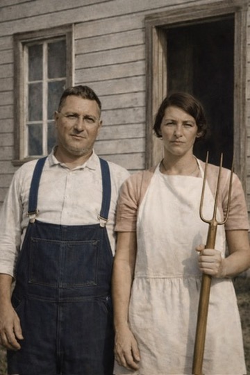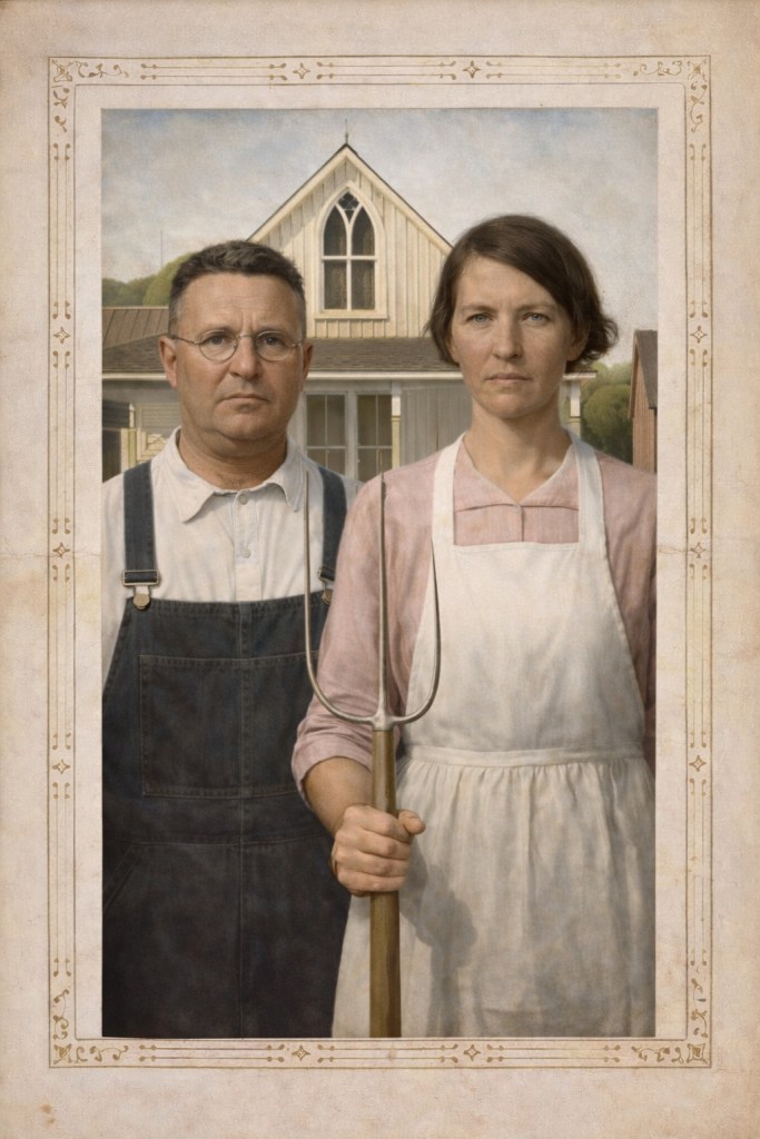 Et là, vous voyez comme moi? Il me semble évident que ce couple a très bien pu servir d’inspiration à Grant Wood pour sa plus célèbre peinture.