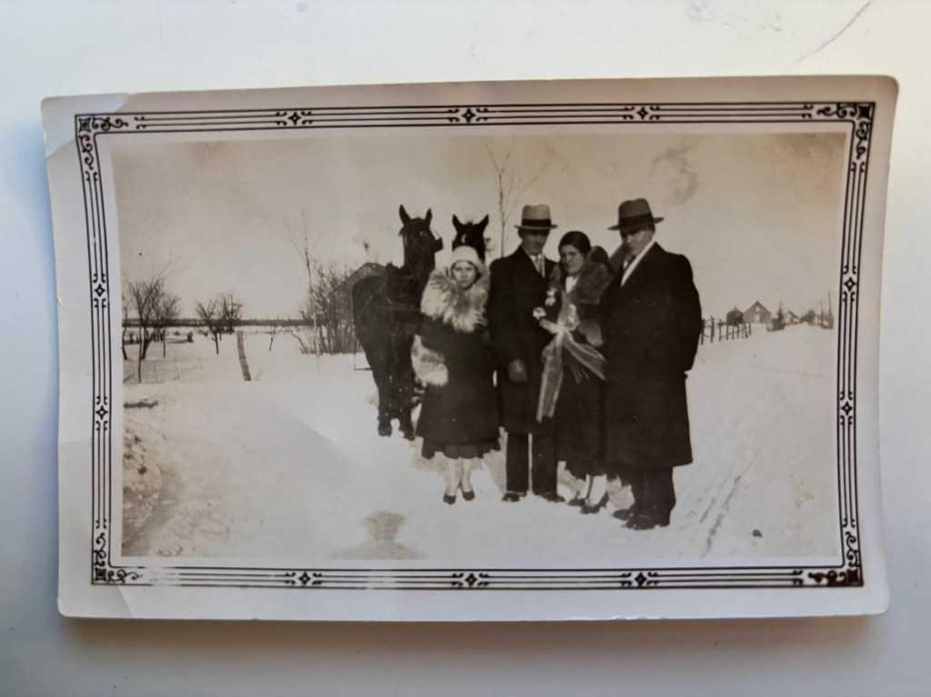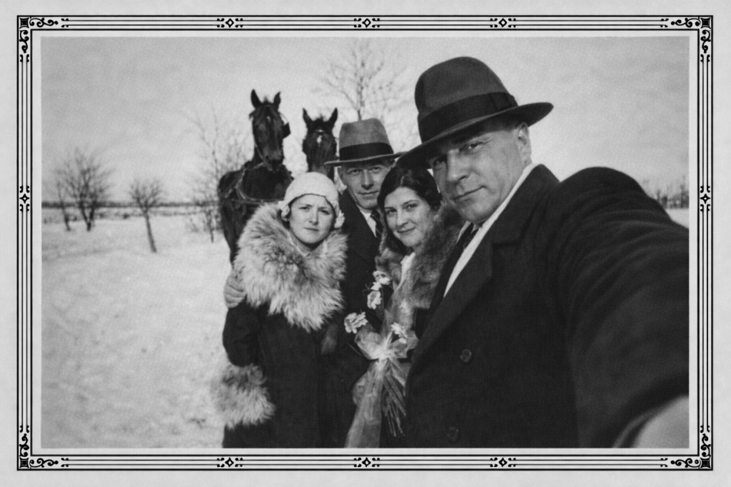 Mais alors, me suis-je demandé… si ChatGPT a fait disparaître l’ombre du photographe en améliorant la photo… peut-être que celui-ci a aussi réellement disparu au moment dans l’histoire où il devait prendre la photo? Et si tel est le cas, cela voudrait dire que ces deux hommes et deux femmes (et leurs deux chevaux) se sont retrouvés bien dépourvus au moment d’immortaliser la scène. Ayayaye…