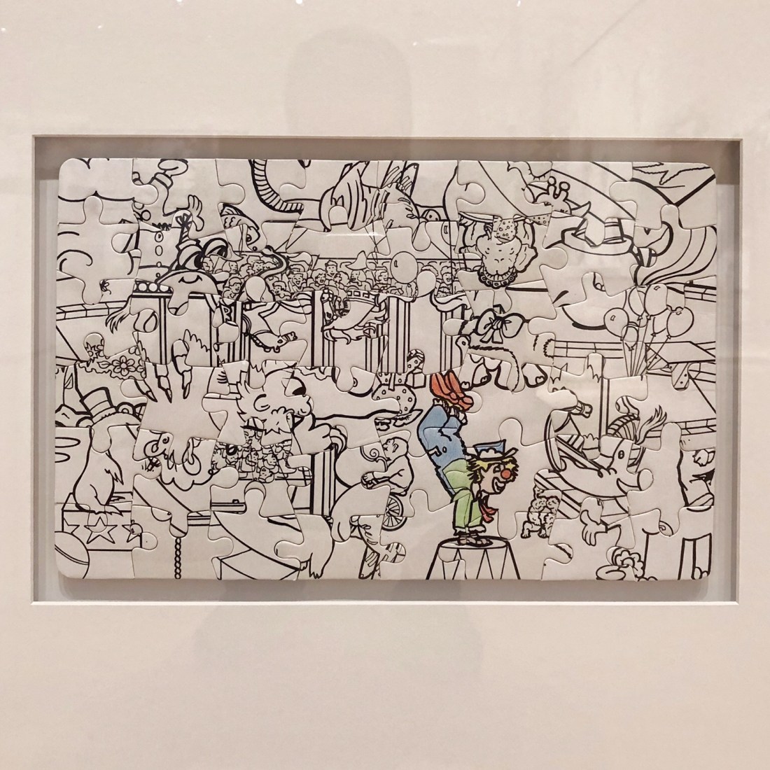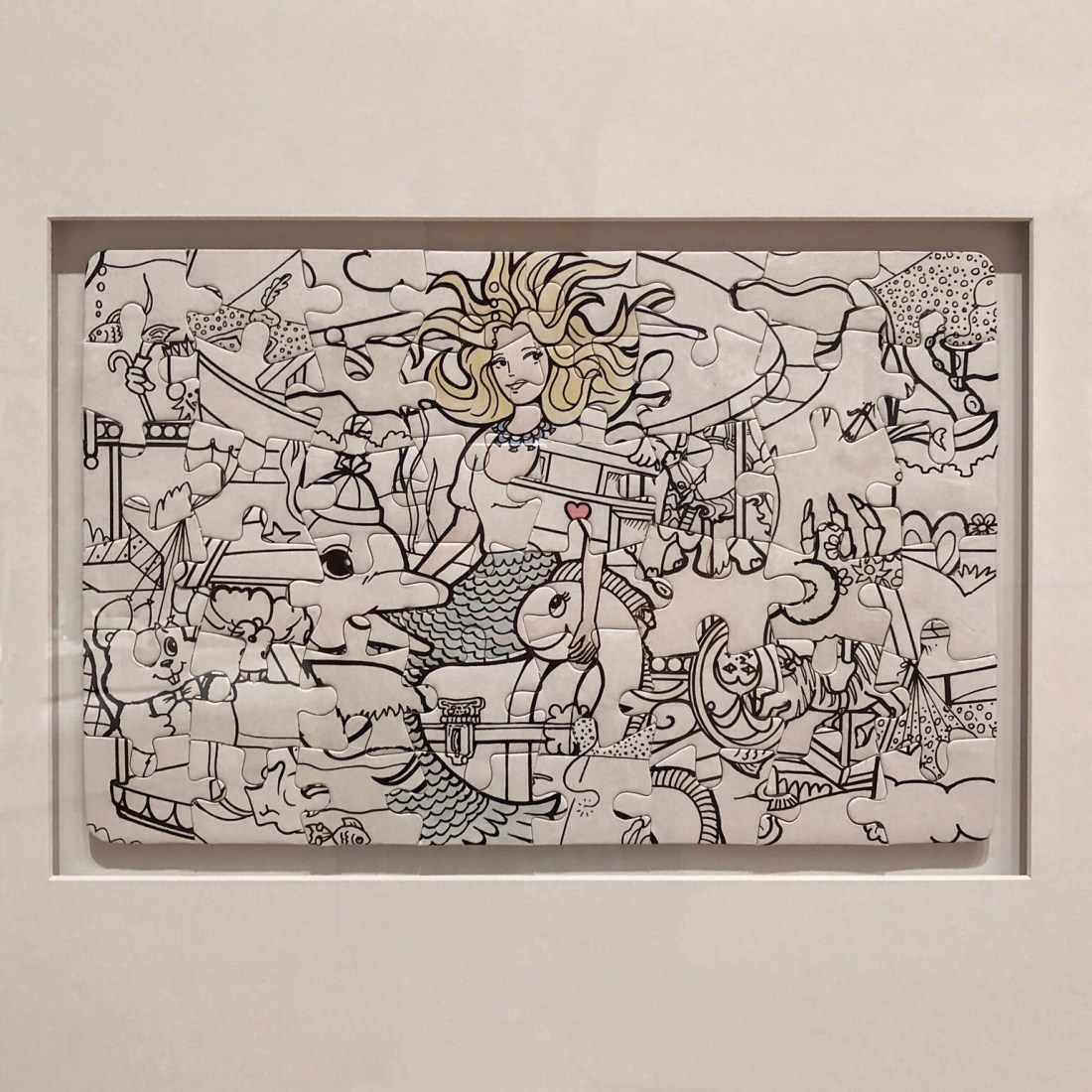 Ainsi, en partant de multiples copies de six casse-tête différents, dont les pièces avaient des formes identiques, malgré des images différentes, l’artiste a pu composer une mosaïque de 45 cadres, contenant chacun un casse-tête inédit, qui semble chaque fois raconter une histoire différente — parfois soulignée par quelques ajouts de couleurs.