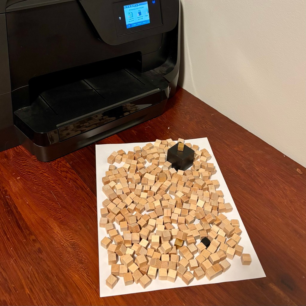 À mon retour, j’ai trouvé devant l’imprimante une page couverte de tout petits blocs de bois. Et le socle de Charles et de la Grande Vague.
