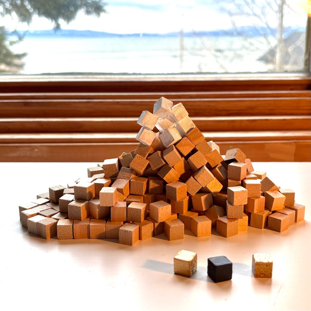 Au retour, en voyant que les sommets de Charlevoix avaient pris des allures de Mont Blanc, ça m’a donné envie d’utiliser les petits cubes de bois trouvés près de l’imprimante hier matin pour en faire une montagne enneigée.