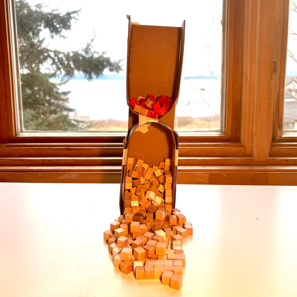 Pour célébrer ma découverte : j’ai fabriqué une forme de sablier pour disposer les cubes. Dans la partie du haut, j’ai disposé les 31 jours qu’il reste à l’année, dont 25 que j’ai peints en rouge, pour en faire une sorte de calendrier de l’Avent.