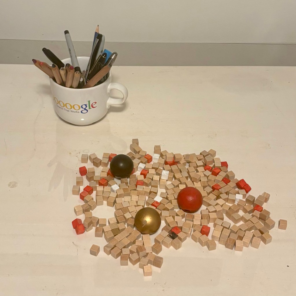 En passant dans mon bureau pour rassembler mes affaires avant de partir vers l’autobus, j’ai constaté que trois sphères étaient apparues parmi les petits cubes éparpillés dans mon espace de bricolage.
