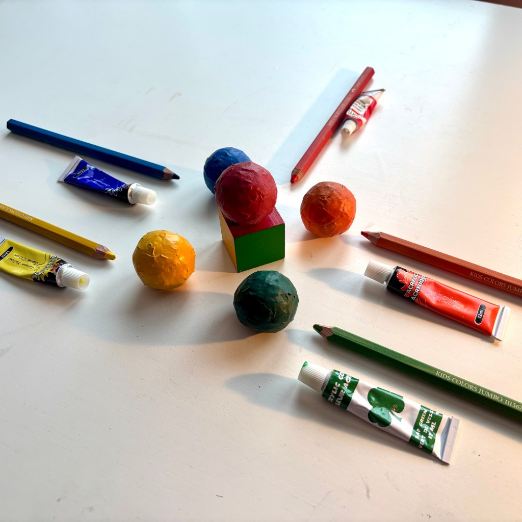 À mon retour… surprise… des sphères étaient apparues… de couleurs assorties à chacune des faces… et des crayons étaient sortis, comme par enchantement, de leur étui… et des tubes de peinture s’étaient joint à la chorégraphie — parce que oui… tout ça dansait devant mes yeux, comme dans une farandole imaginée par Walt Disney, ou, mieux, par Frédéric Back…